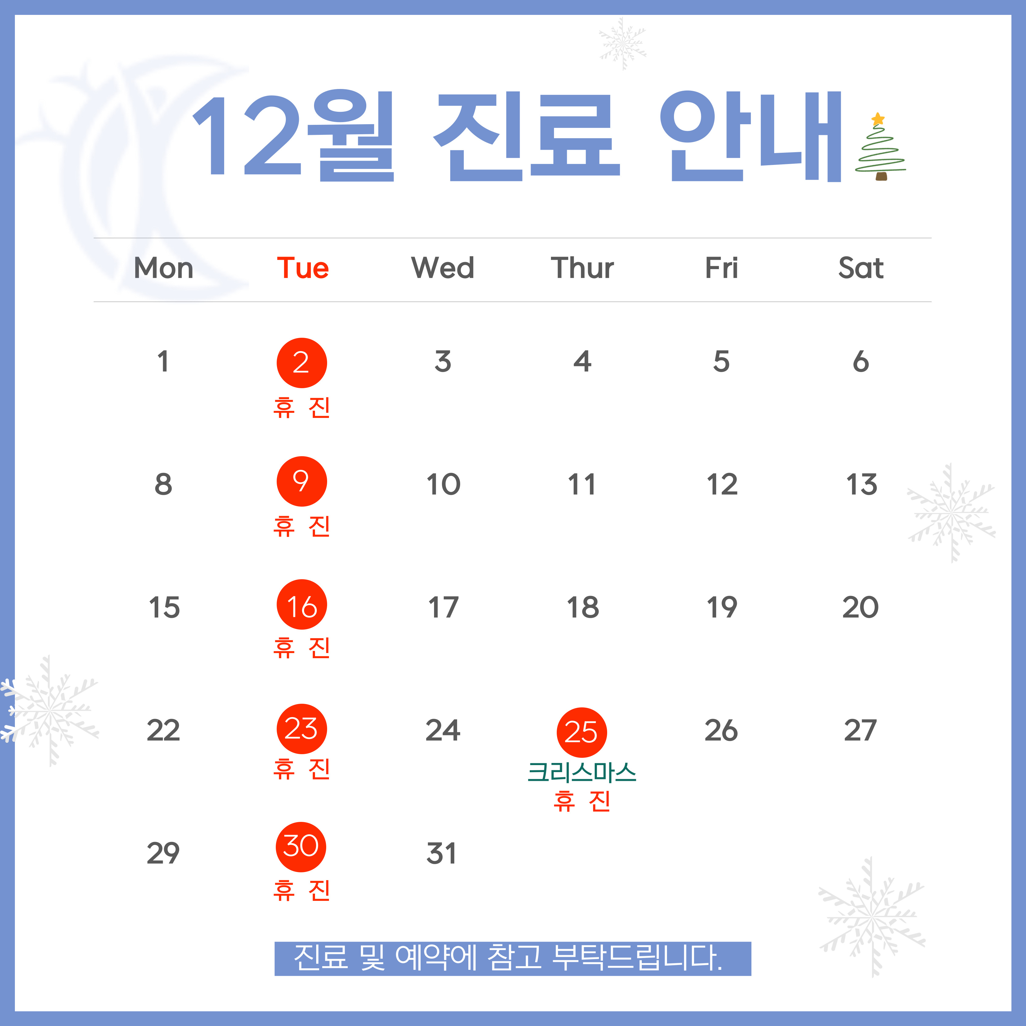 화요일 및 일요일, 공휴일이 휴진입니다.